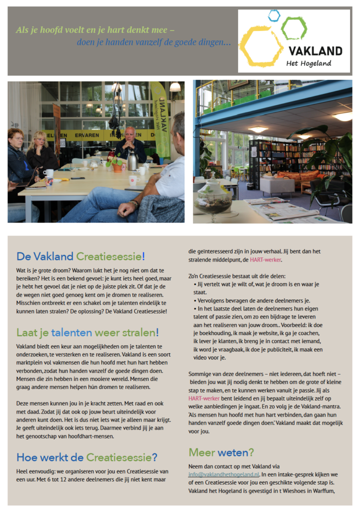 Sommige van deze deelnemers – niet iedereen, dat hoeft niet – bieden jou wat jij nodig denkt te hebben om de grote of kleine stap te maken, en te kunnen werken vanuit je passie. Jij als HART-werker bent leidend en jij bepaalt uiteindelijk zelf op welke aanbiedingen je ingaat. En zo volg je de Vakland-mantra. ‘Als mensen hun hoofd met hun hart verbinden, dan gaan hun handen vanzelf goede dingen doen.’ Vakland maakt dat mogelijk voor jou.